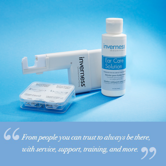 Inverness Aftercare Solution At Inverness, our care doesn’t stop once your ears are pierced. Our Aftercare Solution is specially formulated to soothe and cleanse your newly-pierced ears without the drying or chapping that can come from using rubbing alcohol or hydrogen peroxide.